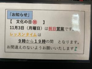 来週の11月3日(月曜日)は、「文化の日」で祝日営業になります!
