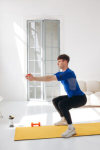 股関節を曲げてお尻を下げ、太ももが床と平行になるまで腰を落とします。