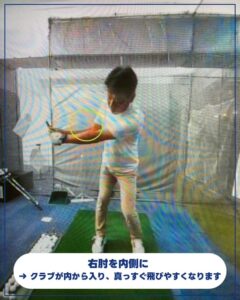 📸2枚目:右肘を内側に → クラブが内から入り、真っすぐ飛びやすくなります✨