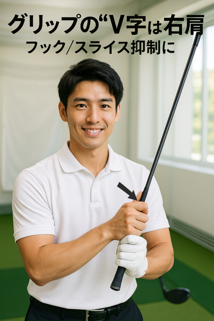 メリット3:フックの防止にもなる(フックに悩む方へ) 逆に、フックやチーピンに悩んでいる方は、V字が右肩よりも「右」を向きすぎている「ストロンググリップ」になっている可能性が高いです。この場合も、V字を「右肩」に戻すことで、過度なフェースターンが抑えられ、球筋が安定します。