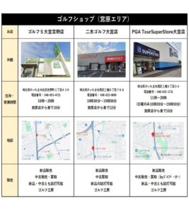 宮原店から車で15分程度の範囲にゴルフショップが3軒あります。レッスン中にクラブやボールの話題が多く出ますので、何かのお役に立てれば幸いです。