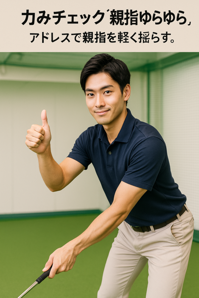 「親指ゆらゆら」は、力みのバロメーターです。 毎回のショットの前にこのチェックをルーティンとして取り入れ、常にリラックスした状態からスイングを始動する癖をつけましょう。