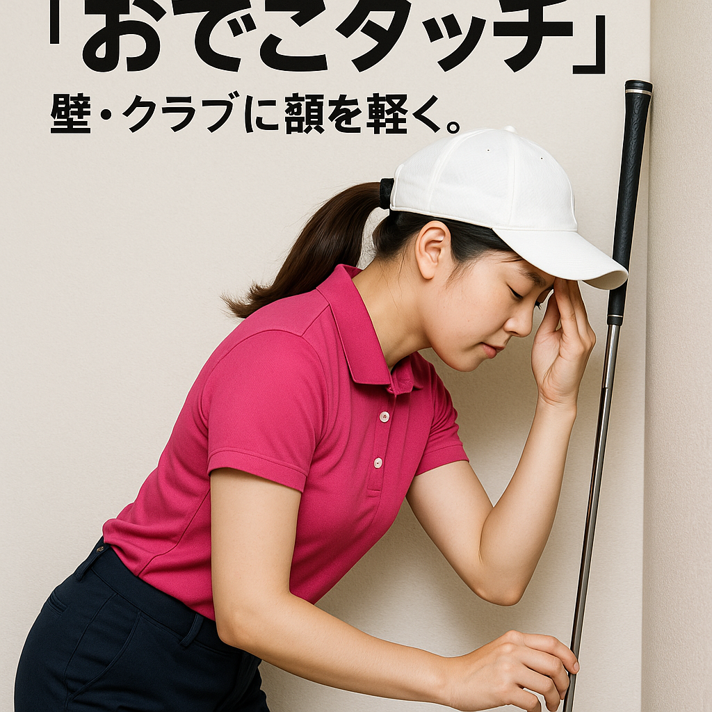 スイングの確認(素振り) まずはクラブを持たずにシャドースイングから。おでこが離れないように、特に**「お尻を後ろに引いたまま」体を回転させる意識を持ちます。 ✨ テイクバックで体が伸び上がらないか? ✨ インパクトで頭がボール方向に突っ込んでいないか? ✨ そして何より、インパクトで頭が上がっていないか?** これらをおでこの接点でチェックします。