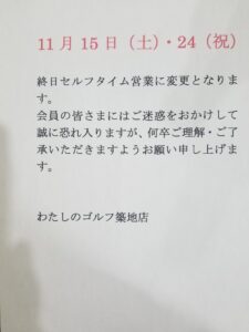 11月24日(祝)は終日セルフタイム営業に変更となります。