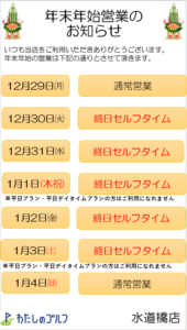 平素より「わたしのゴルフ水道橋店」をご利用いただき誠にありがとうございます。年末年始の営業は以下の通りです。12月30日~1月3日は終日セルフタイム営業となり、平日プラン・平日デイタイムプランの方はご利用いただけません。12月29日・1月4日は通常営業です。ご不便をおかけしますが、何卒ご理解のほどお願い申し上げます。