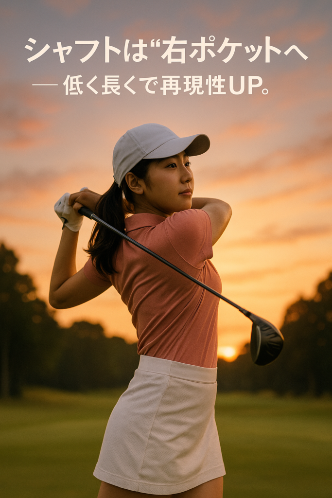 わたしのゴルフ野方店が今回ご紹介するのは、「シャフトは“右ポケット”へ — 低く長くで再現性UP」というテーマ。この二つのポイントを意識するだけで、あなたのスイングは劇的に安定し、脱力と精度を両立させることができます。