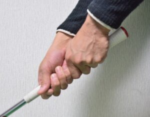右手がシャフトに近づくほど短く持つと、飛距離が落ちることを実感できます。