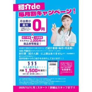 会員のかたのご紹介でお友達やご家族のかたが新規入会していただくと、紹介者様&入会者様に2000円分の商品券も贈呈♪