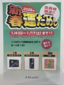 また、1月4日(日)~1月17日(土)のあいだにご来店いただいた会員様は、クジを引いていただき豪華景品をゲットしていただく「新春運だめし!」を開催いたします。(お一人様一回のみ)