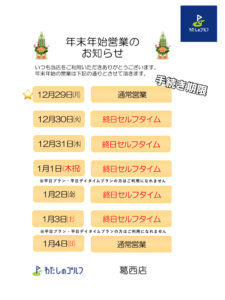 年末年始は、12月30日から1月3日までがセルフ営業となります。