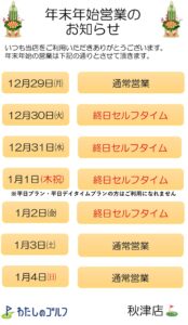 年末年始の 12/30(火)~1/2(金)までは 終日セルフタイムです。