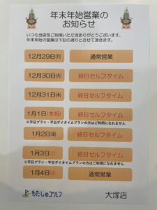 「わたしのゴルフ大塚店」のレッスン営業は本日12月29日(月)までとなっており、12月30日(火)~1月3日(土)の5日間はお休みをいただきます。