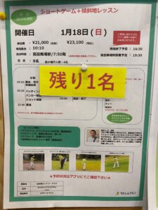 1月18日(日曜日)「ショートゲーム+傾斜地レッスン」が現在1名申込可能となっております!