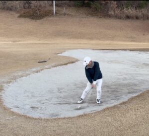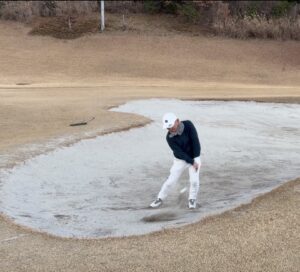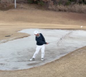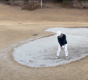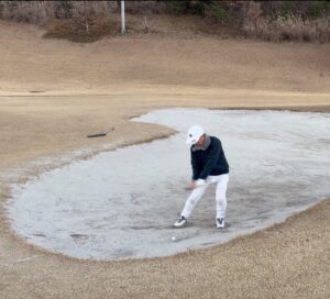 バンカーでボールを上げたいから心理的に掬い上げる動きが入ると上手くいきません。ヘッドは下向きに叩きつけるイメージで!
