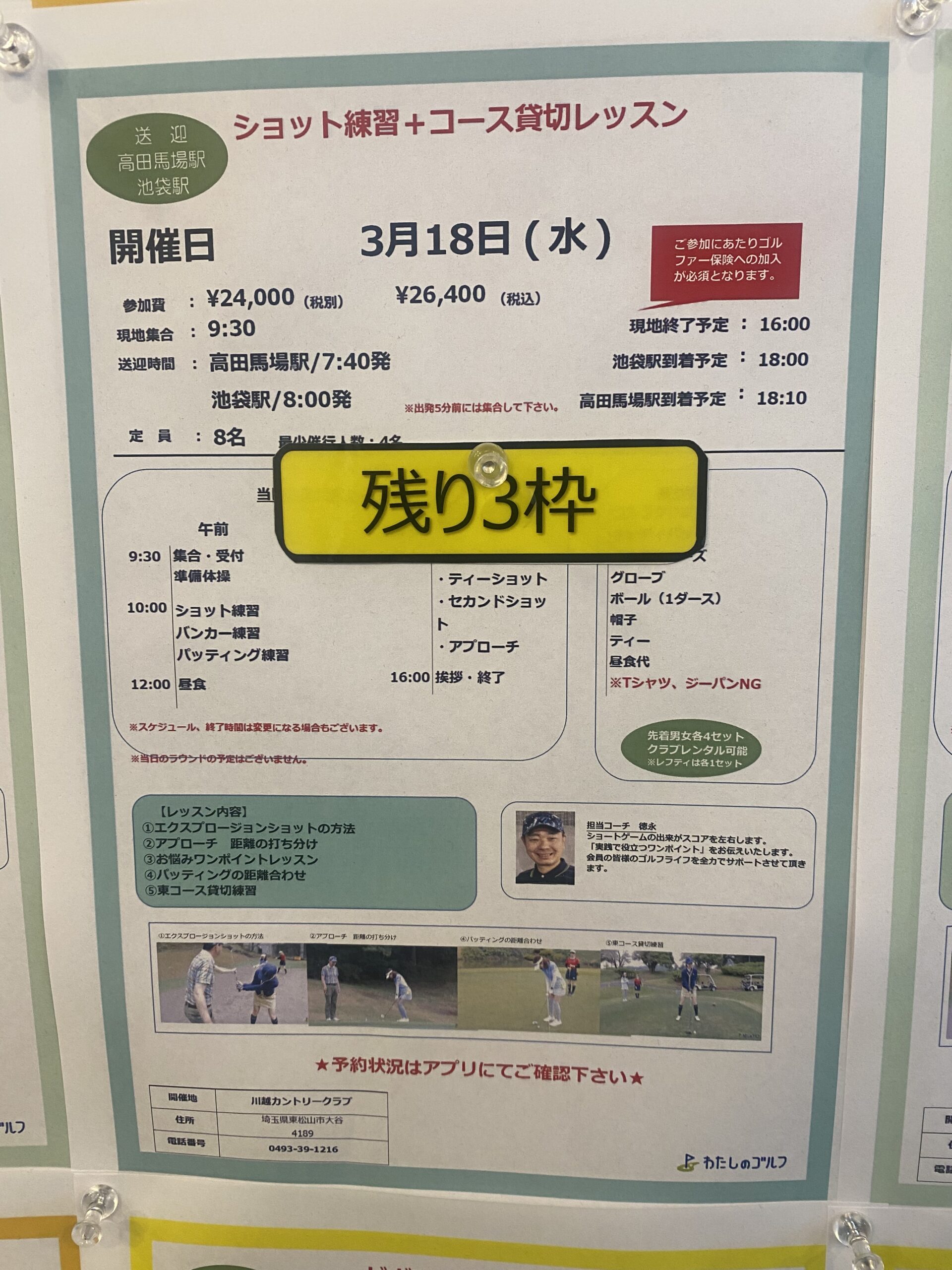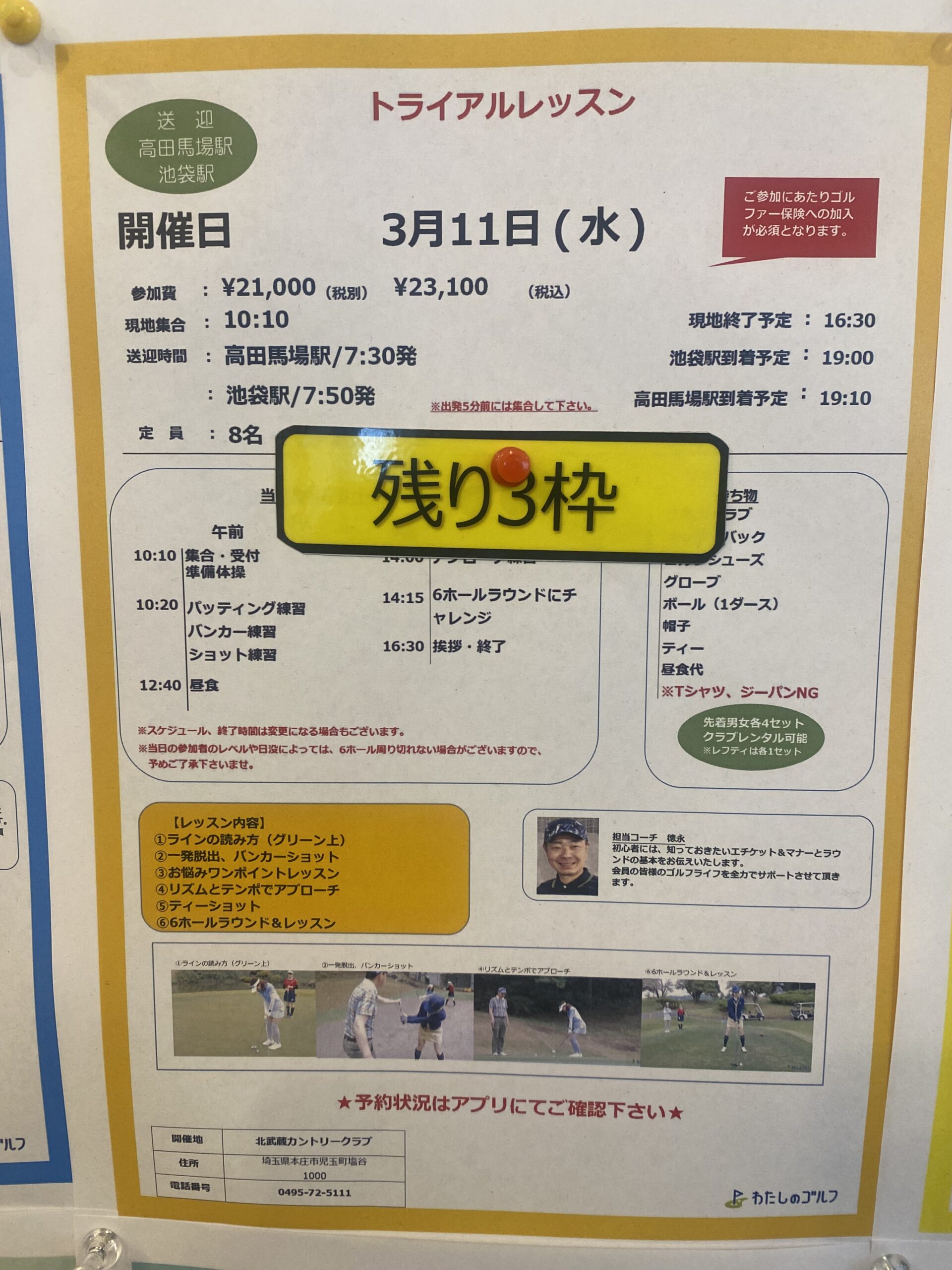 Remind!!わたしのゴルフ目白店 3月コースレッスン空き情報!!~JR目白駅徒歩3分 24H使い放題インドアゴルフスクール~