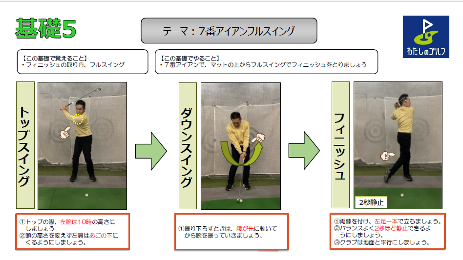 今回は「基礎5」:マットの上からフルスイング、フィニッシュまでをレッスン。