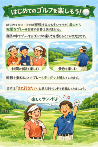はじめてのコースでは緊張する方も多いですが、最初から完璧なプレーを目指す必要はありません。