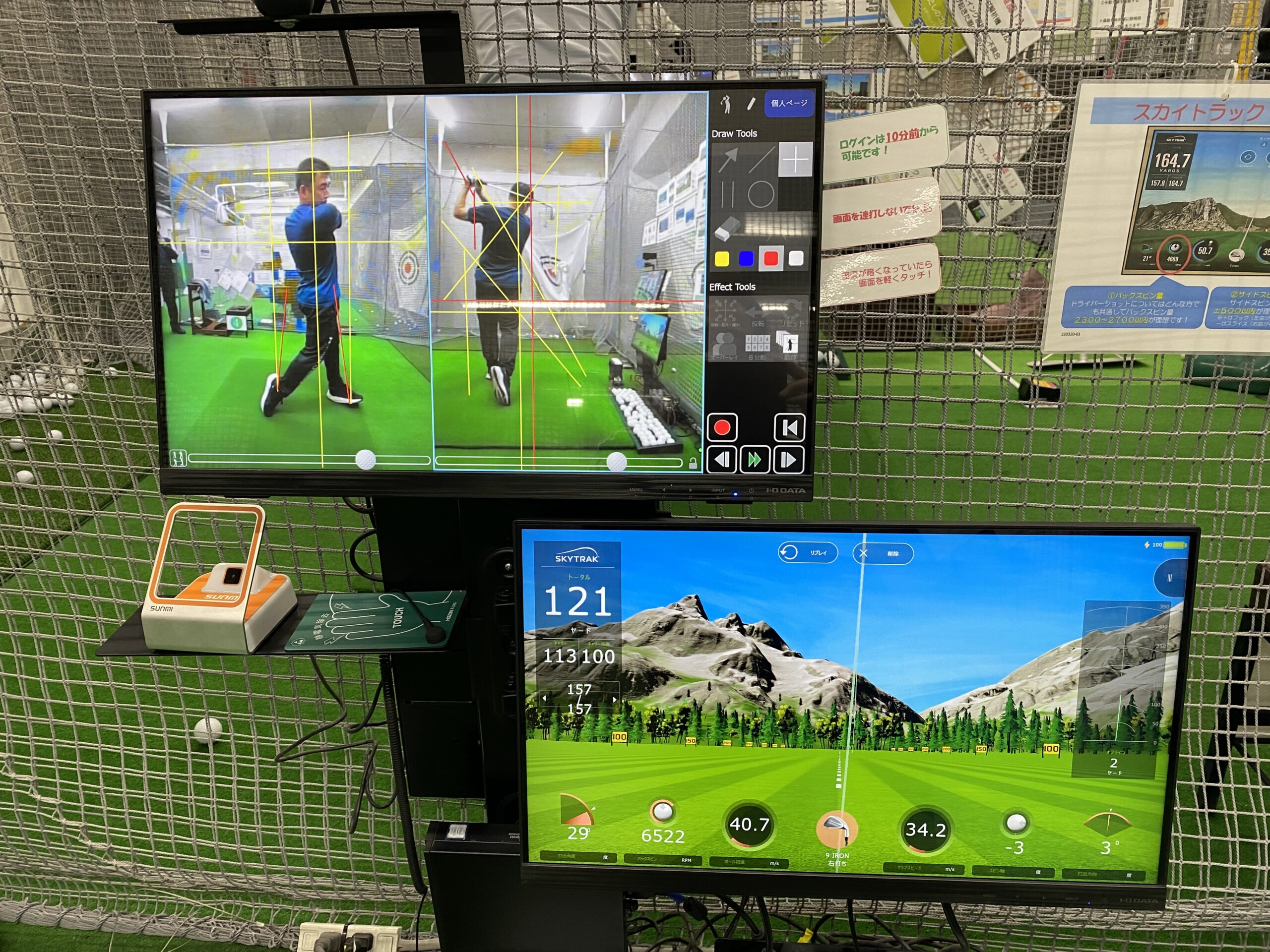 全打席当社独自のオリジナルスイング解析機を設置し、ただの解析機ではなく店舗内撮影動画をマイページで動画保存ができ、それを自分のスマホで再生、比較更にスイング分析できる機能があります。