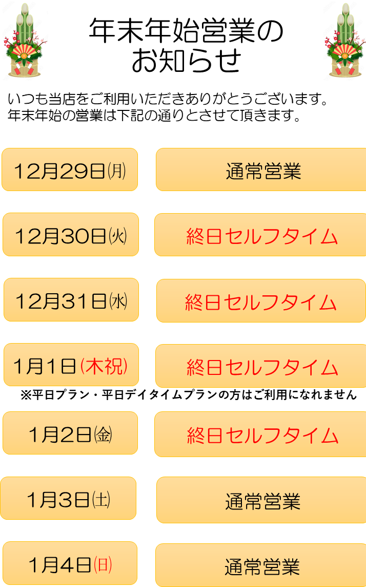 | 平日レッスン定休日セルフタイム | |||||||||||||||||||||||